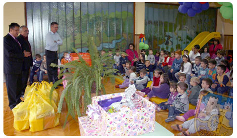 Predsednik i zamenik u društvu direktora vrtića Dejana Miletića, najpre su posetili najmladje iz takozvane grupe bebica kojima su uz čestitke podelili slatkiše i igračke a potom su ih u velikoj sali sačekali mališani starijih uzrasta.