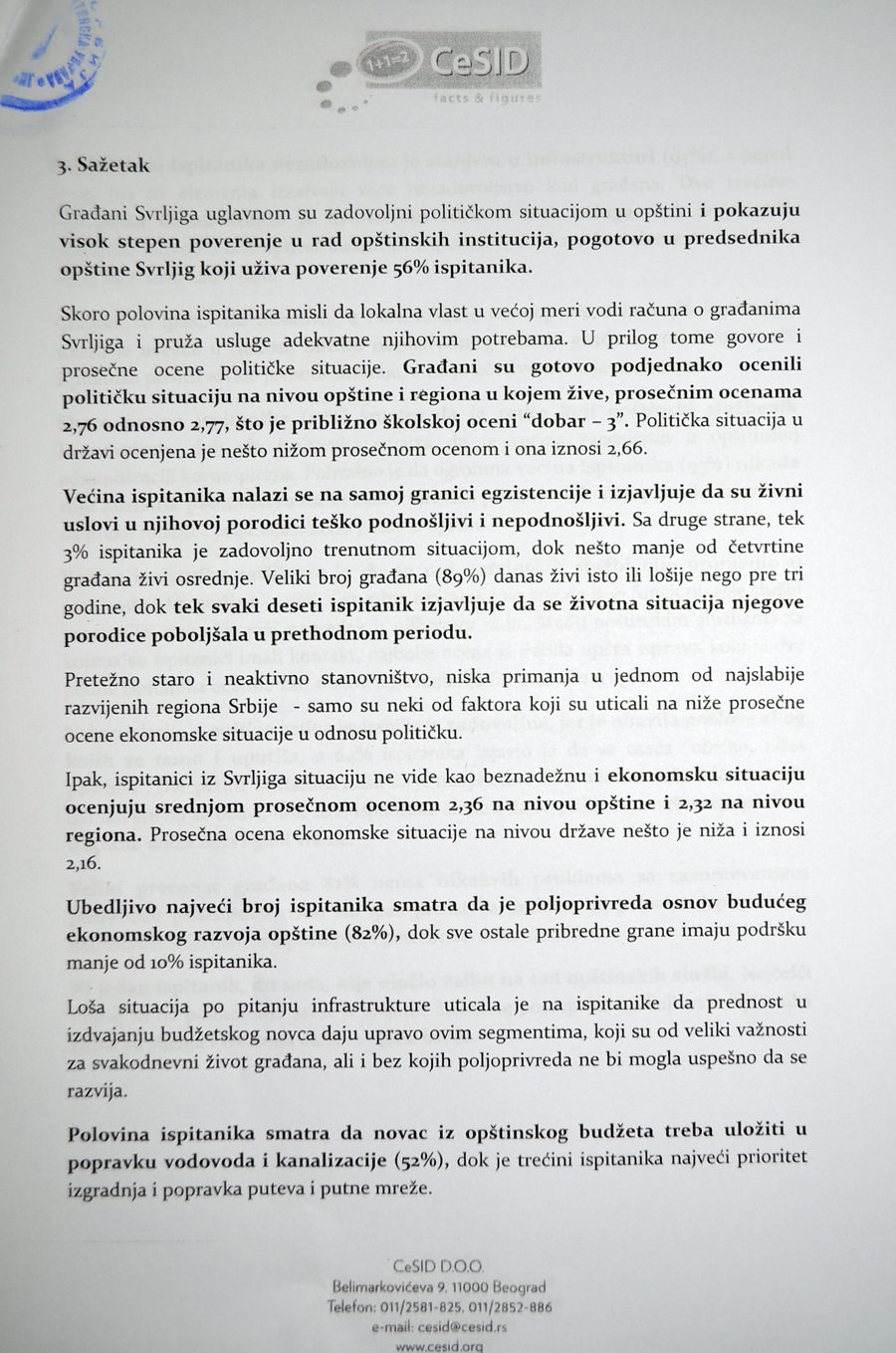 – Можемо бити задовољни резултатима истраживања или тачније проценом нашиг суграђана који су у овој анкети исказали високи степен поверења у своје руководство и показали несумњиви оптимизам у боље сутра. Грађани су својим предлозима и потребама практично одредили смернице будућег развоја општине Сврљиг. Њихово поверење је за нас обавеза а приоритете ћемо одредити на основу њихових хтења и виђења, каже председник општине Сврљиг, Милија Милетић.